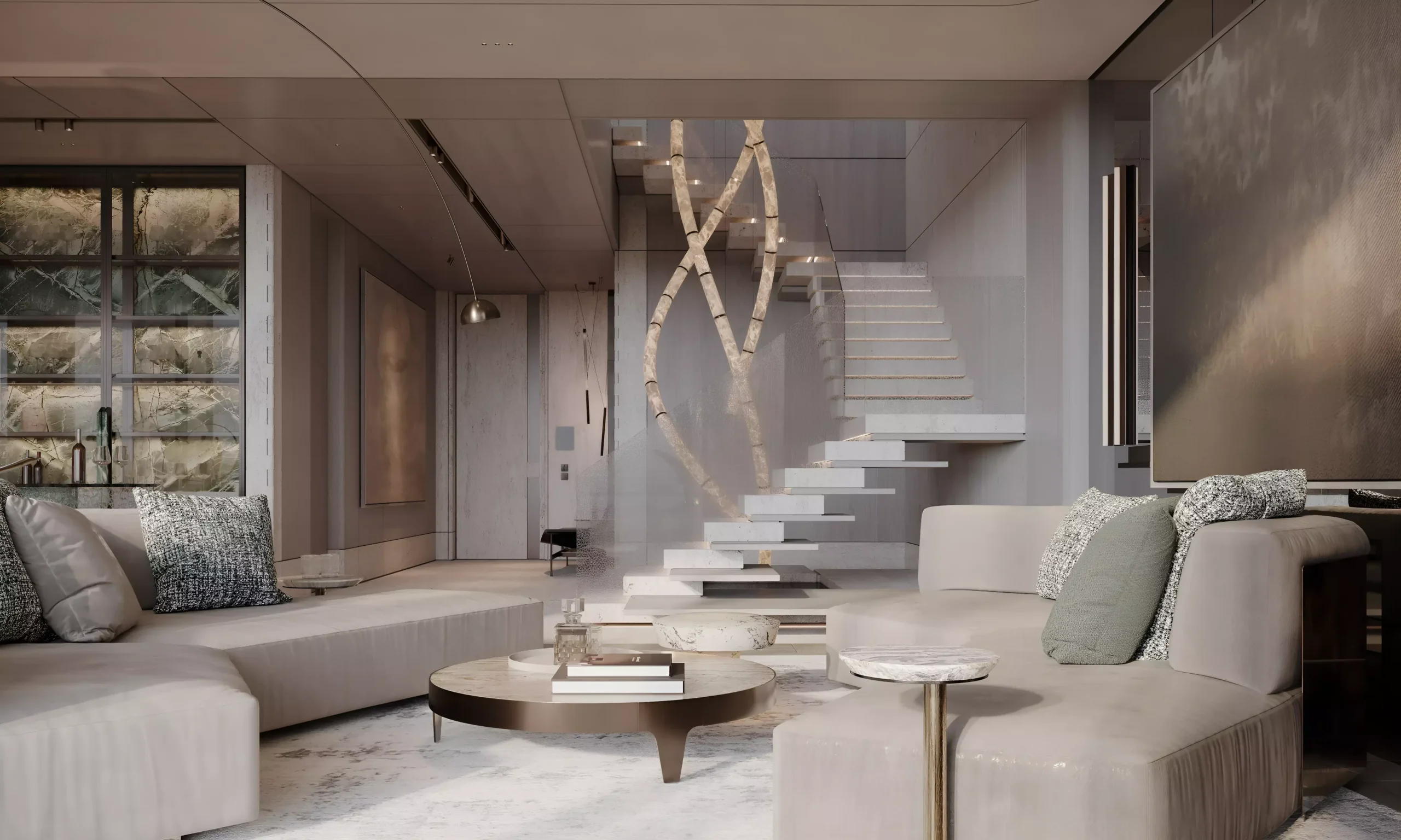 The interior narrative is composed by the distinguished French design house Gilles & Boissier. Their aesthetic vocabulary is both restrained and indulgent — classical undertones interwoven with contemporary finesse. Rich marbles, tactile fabrics, and meticulously curated finishes generate an atmosphere that is neither ostentatious nor austere, but exquisitely balanced.